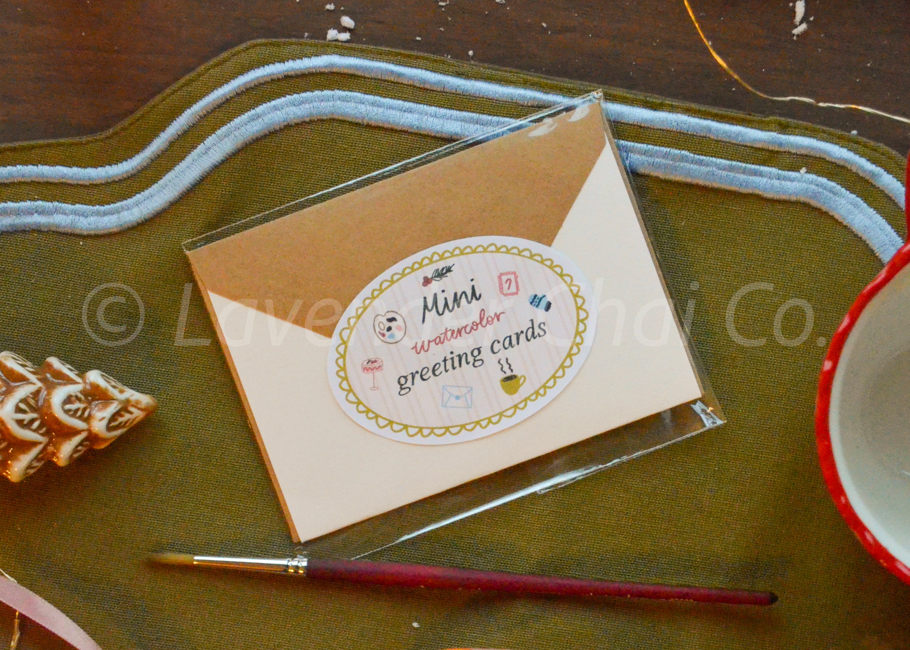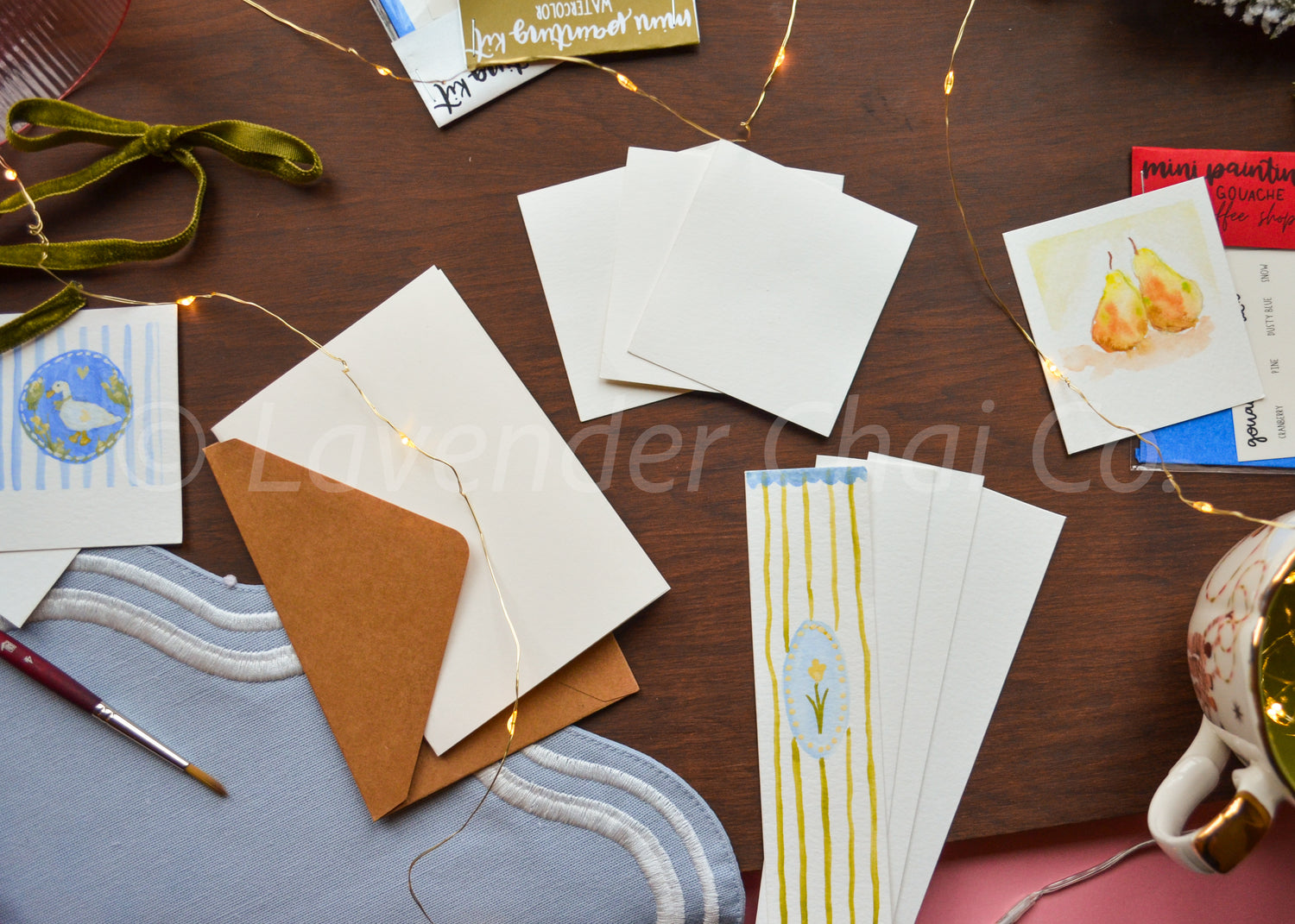 Along with a blank mini watercolor greeting card (so cute!) you'll receive a 3-pack of extra Mini Painting Cards (day 13) and a set of four blank bookmarks (40-lb watercolor paper) (day 3).