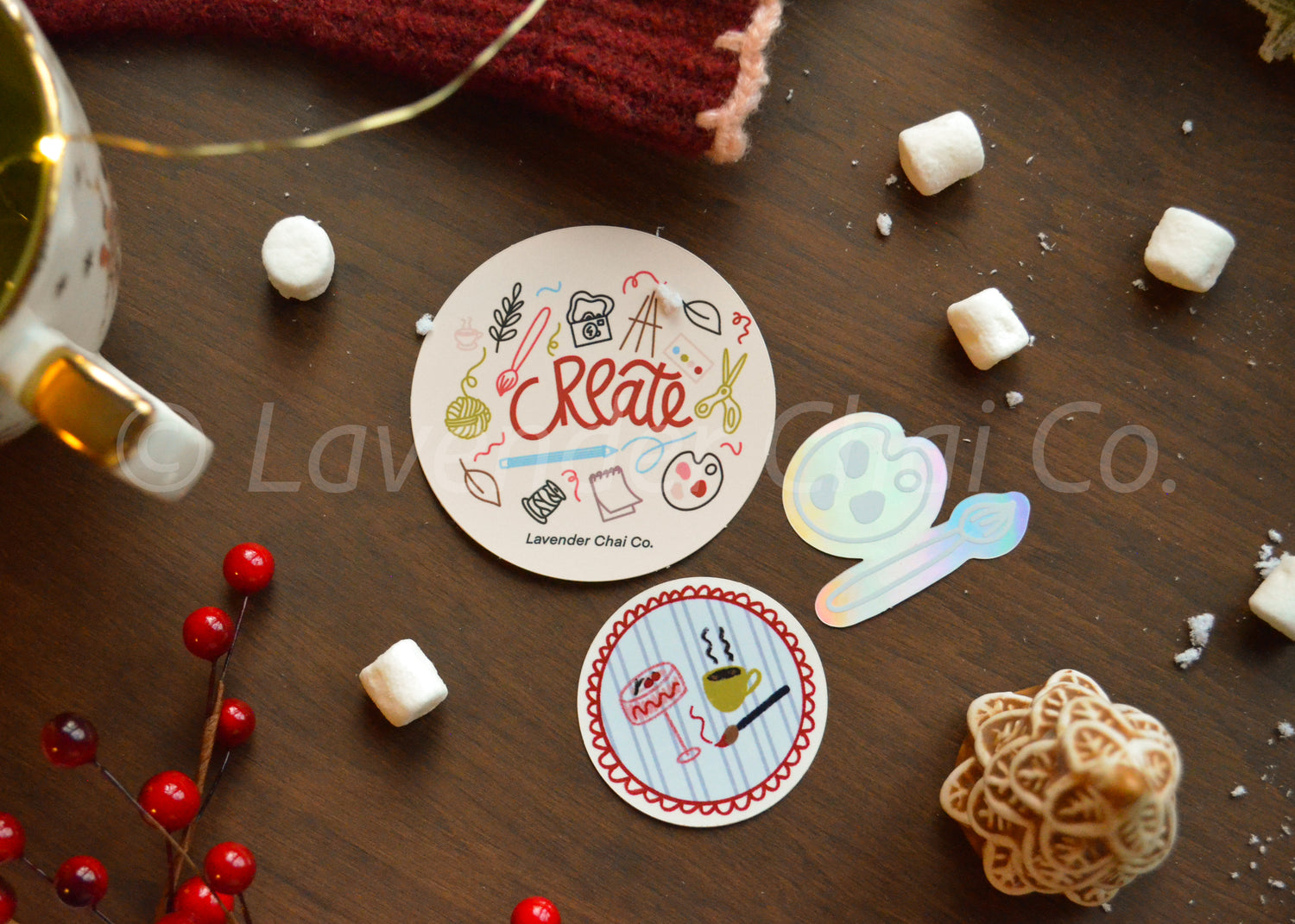 3" Create Sticker (day 11), 2" Paint & Sip Sticker (day 5), 2" Holographic Paint Palette Sticker (day 21).