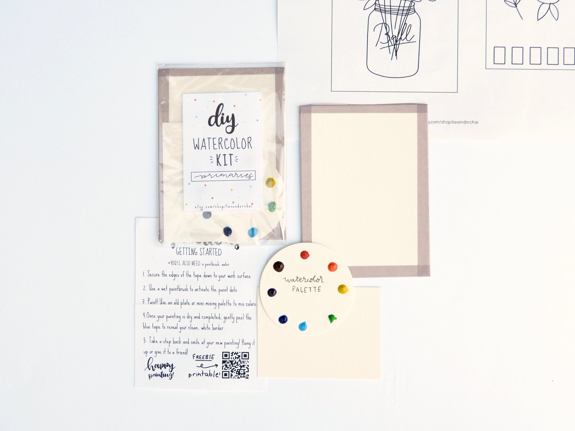 1. High-quality watercolor paper. We use a cellulose-based 140-lb cold-pressed watercolor paper in all our kits. Our greeting card kits use a lighter watercolor paper for ease of mailing!
