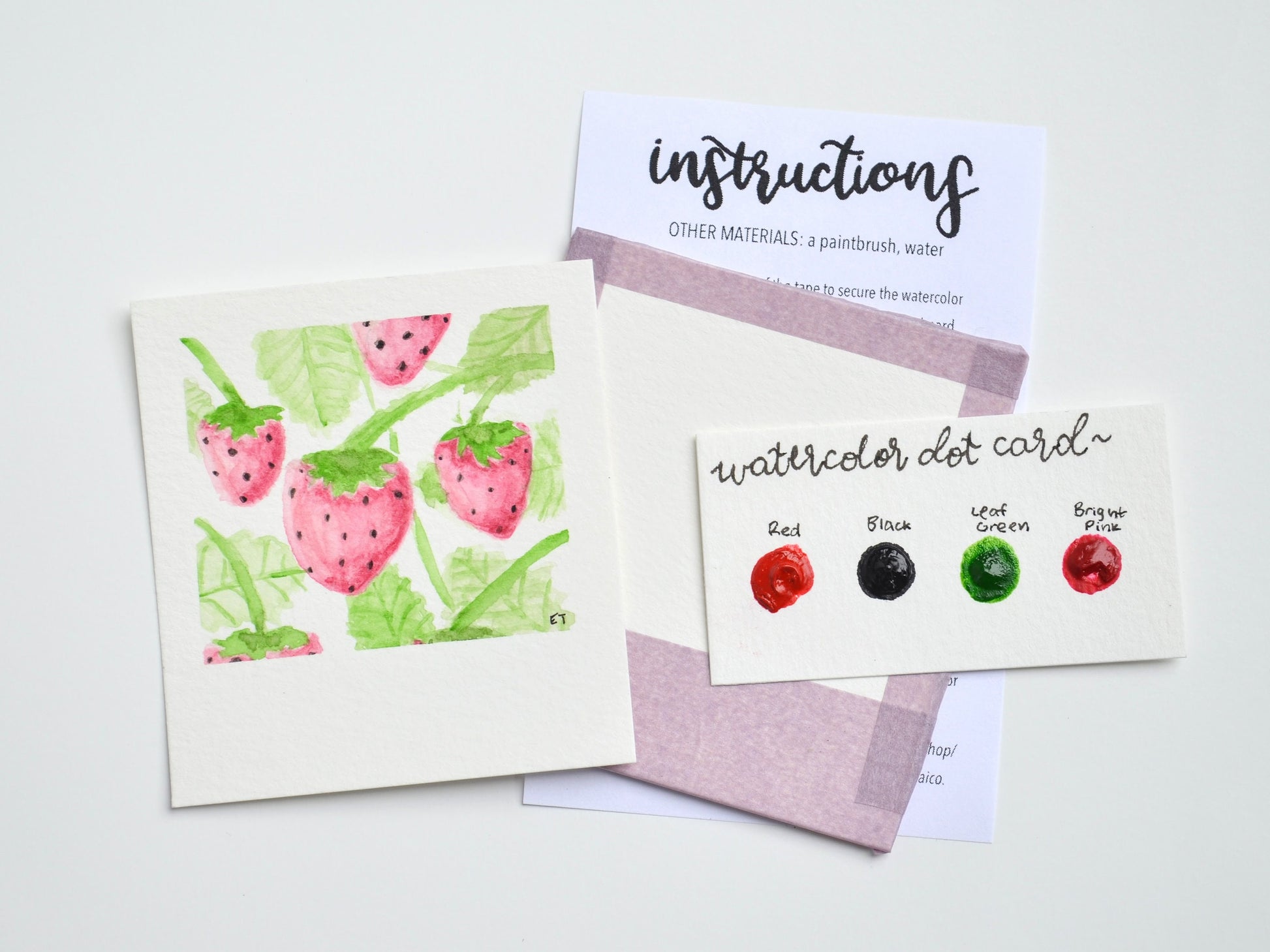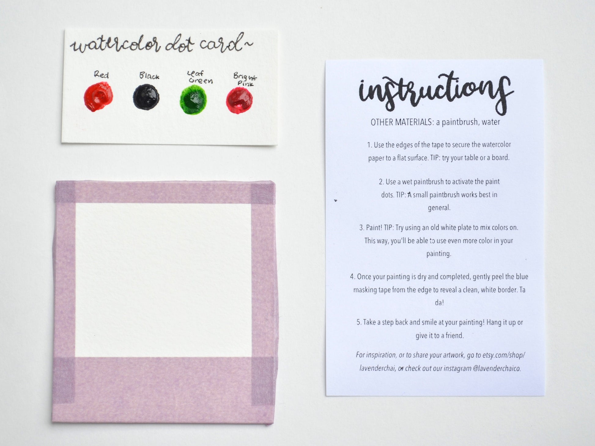 1. High-quality watercolor paper. We use a cellulose-based 140-lb cold-pressed watercolor paper in all our kits. Our greeting card kits use a lighter watercolor paper for ease of mailing!